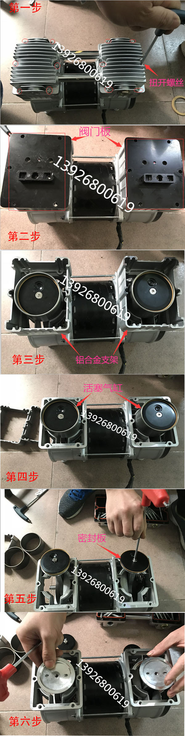 無油真空泵拆裝分析圖:第一步,鋁合蓋上的螺絲扭開,上面有12顆螺絲,螺絲扭掉打開鋁合蓋子就可以看到閥門板。第二步,可以直接把閥門板拿下來,就可以看到活塞氣缸了。第三步,把上面的鋁合支架可以直接拿下來。第四步,可以看到活塞氣缸了,可以直接拔下來。第五步,接下來是最后一步了,看到的是皮碗,把上面的螺絲妞下來,皮碗就可以拆下來了。這是一款JP-240無油真空泵拆圖,拆的過程中要注意,閥門板上面的那個鐵片,如果鐵片翹起來了,會導致真空泵漏氣沒真空。皮碗拆損壞了會導致沒有吸力,漏氣真空度下降。壞了會導致沒有吸力,漏氣真空度下降。