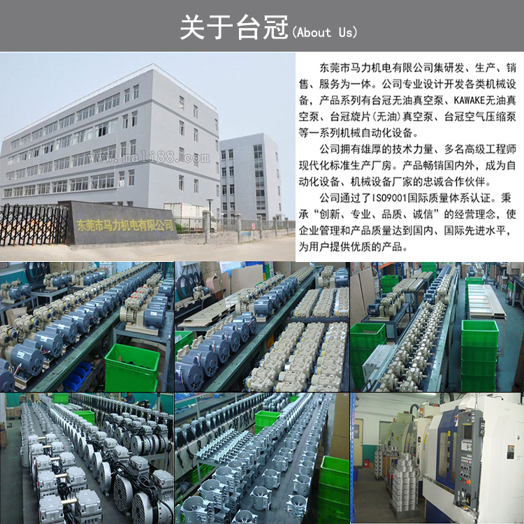 公司專業設計開發各類機械設備,產品系列有臺冠無油真空泵、Kawake無油真空泵、旋片(無油)真空泵、空氣壓縮泵、移動智能真空(負壓)系統、螺桿真空泵等一系列機械自動化設備。