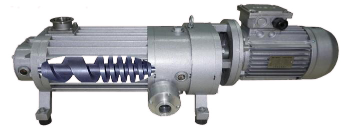 5.TGB 干式復合螺桿真空泵是由兩根平行的螺桿轉子與泵體內壁形成多個密封空 間,轉子與轉子之間、轉子與泵體內壁之間均保持極小的間隙(但不接觸、無摩擦), 在反向同步齒輪驅動下, 氣體持續由進氣口向排氣口傳送的真空泵。由于兩根轉子 和泵體相互之間均無摩擦,故無需潤滑,可保持泵腔及排氣干凈。螺桿真空泵中,氣體被持續推進,通道短,效率高;排氣口低于螺桿位置,排 液能力超強,易清洗; 無中間隔板(爪式真空泵和多級羅茨真空泵有),排氣排液通暢,維修保養簡單。